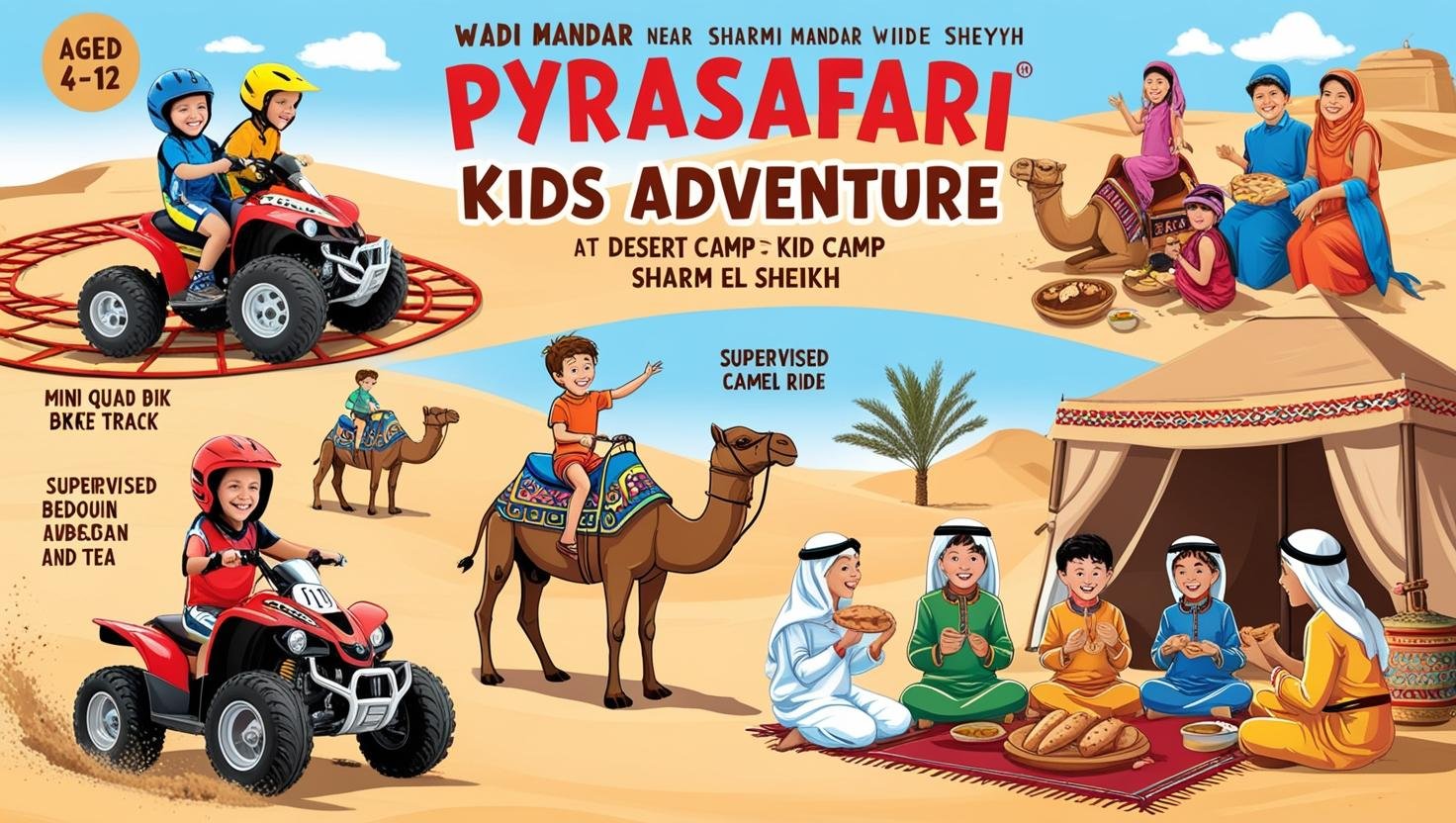 Discover the magic of the Sharm El Sheikh desert with PyraSafari’s exclusive Kids Adventure! Tailored for young explorers (4-12), this luxury tour offers safe mini quad biking, gentle camel rides, and authentic Bedouin cultural immersion, all with convenient hotel transfers from Sharm El Sheikh.